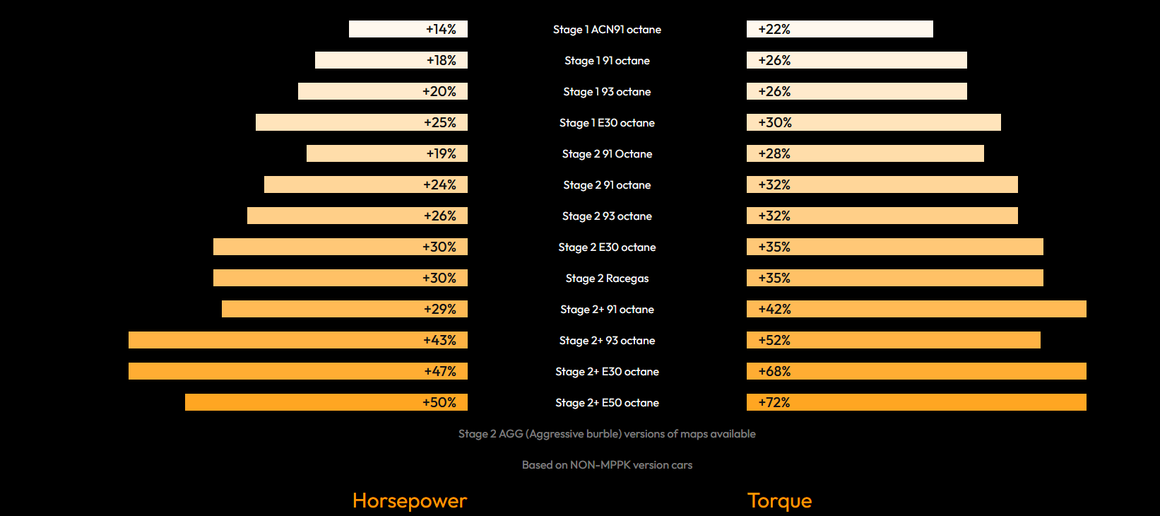 - Stage 2 93 octane: up to 25% HP / 35% TQ
