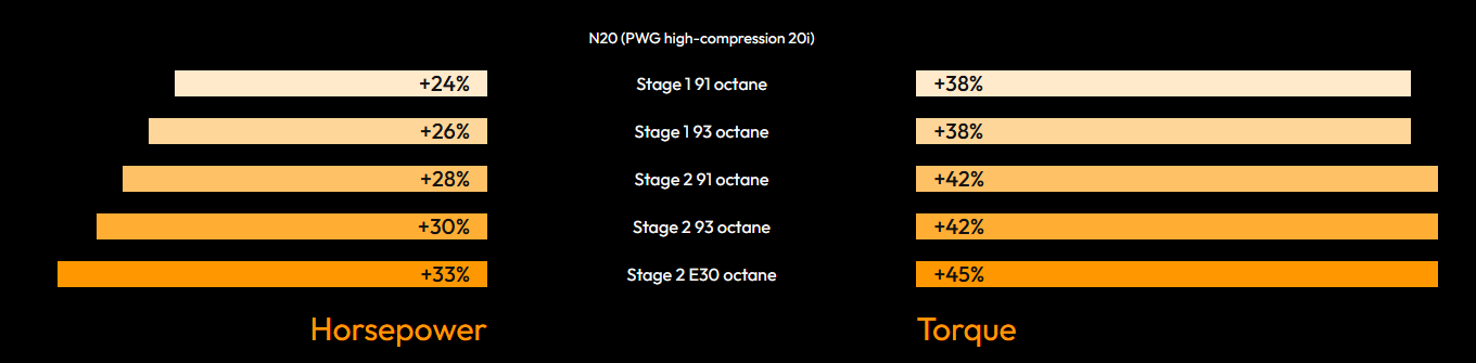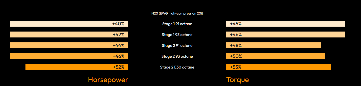 • Stage 1 93 octane: 52% HP / 56% TQ