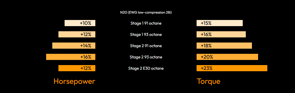 • Stage 1 E30 octane: 21% HP / 24% TQ