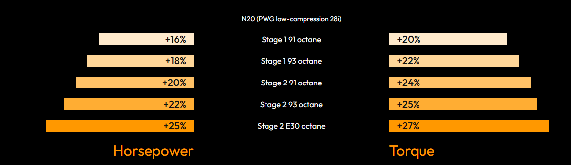 • Stage 2 E30 octane: 25% HP / 27% TQ