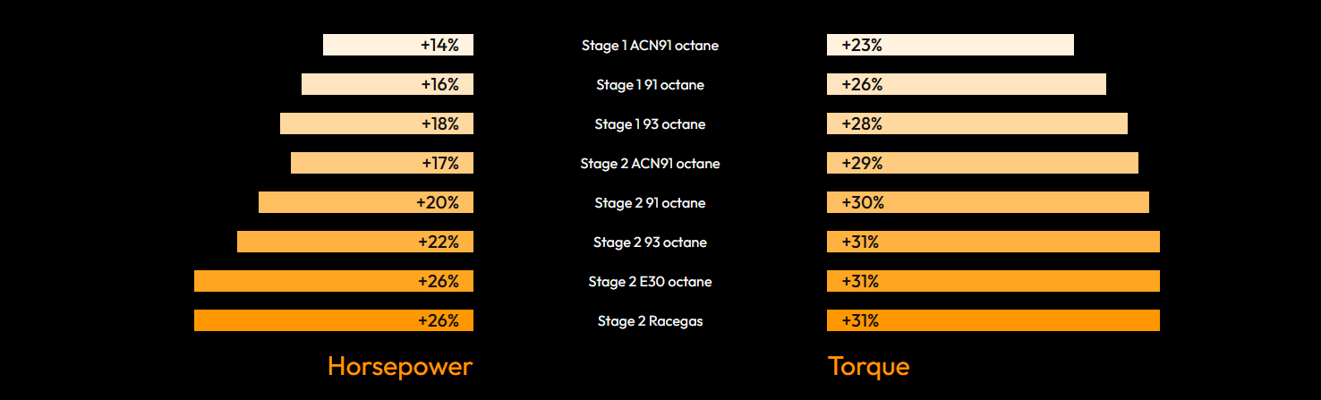 • Stage 2 93 octane: up to 22% HP / 31% TQ